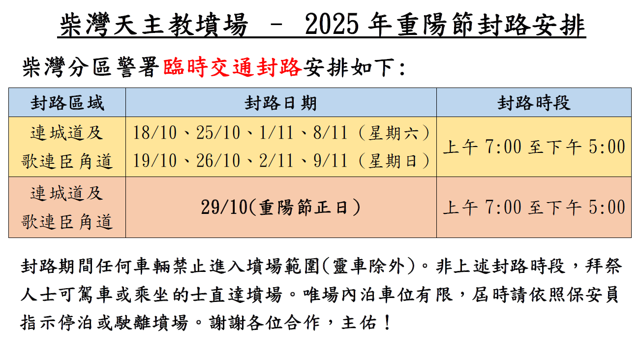 柴灣天主教墳場 - 2025年重陽節封路消息