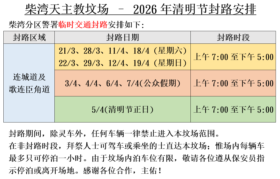 柴湾天主教坟场 - 2026年清明节封路消息
